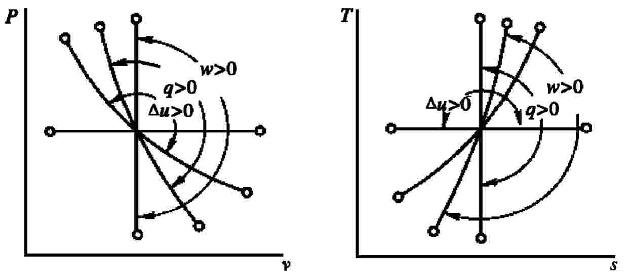 四种典型过程在p-v、T-s图上的曲线形状前已述及,如图1-15所示。为了便于分析多变过程中的能量分配关系,以上述四个典型过程曲线为界,在图1-15上划分出了功、热量和热力学能变化的正、负区域。