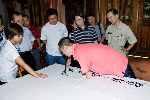 他,四十多岁,河南人,福建泉州承天寺经生,自幼双手截断,却能以书法自立,生活得如此的从容自信,这其中经历了多少的磨难?这是怎样的一种心路历程?
