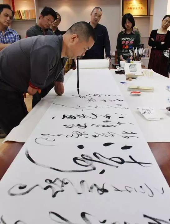 他无手以口衔笔,从容、自信、果断的书写时的状态让人震撼!这种状态是许多以手执笔的人都不具备的。见过口书,但很少见过写的这么好的,提按使转,收放自如;浓淡枯湿,运用合宜;疾徐苍润,不偏不移。线条的质量,体势造型,中规中矩,显然受过正规训练。